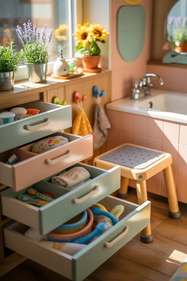 Zum Angebot bei Amazon*Kinder lieben es, selbstständig zu sein – und mit cleverer Planung wird das Badezimmer zum Mitmach-Ort. Tiefe Schubladen mit leichten Fronten ermöglichen auch kleinen Händen Zugang zu Zahnbürste, Waschlappen & Co. Hocker mit Anti-Rutsch-Füßen machen Waschbecken erreichbar und fördern Selbstständigkeit. Besonders praktisch sind stapelbare Aufbewahrungsboxen in bunten Farben – ideal für Spielsachen in der Badewanne oder kleine Handtücher. Auch an der Wand lassen sich kindgerechte Haken anbringen – so bleibt nichts auf dem Boden liegen. Ein niedriges Regal mit Körben schafft Übersicht und hilft beim Ordnung lernen. Wichtig: Alle Materialien sollten bruchsicher, feuchtigkeitsbeständig und leicht zu reinigen sein. So bleibt das Bad ein sicherer und fröhlicher Ort.