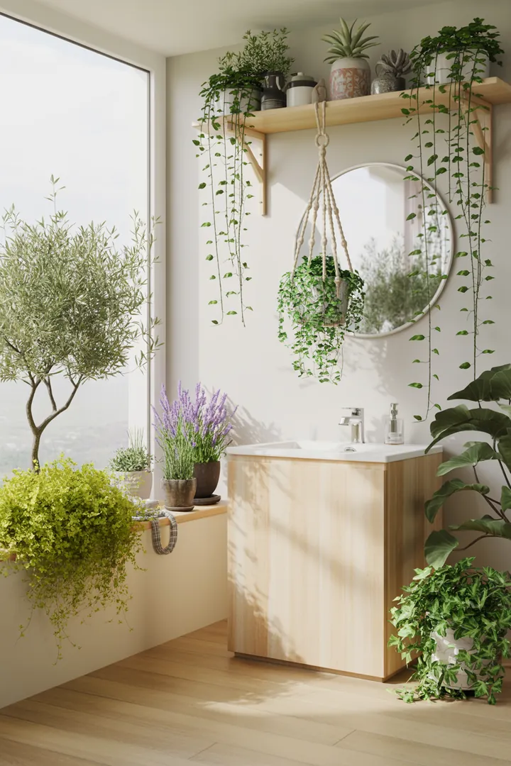 Zum Angebot bei Amazon*Nutzen Sie Wandregale, Fensterbänke oder Aufhänger für Pflanzen – das spart Platz auf dem Boden oder Waschtisch. Auch eine hängende Pflanze in einer Makramee-Halterung wirkt luftig und charmant.