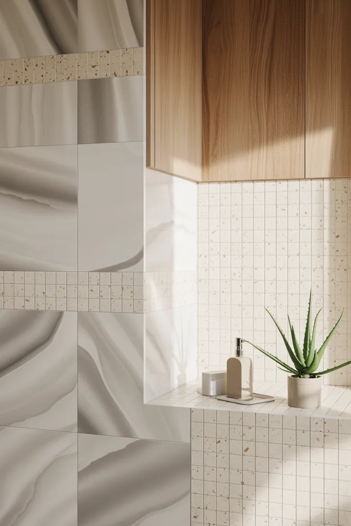 - Klebe-Fliesen in Marmor- oder Terrazzo-Optik