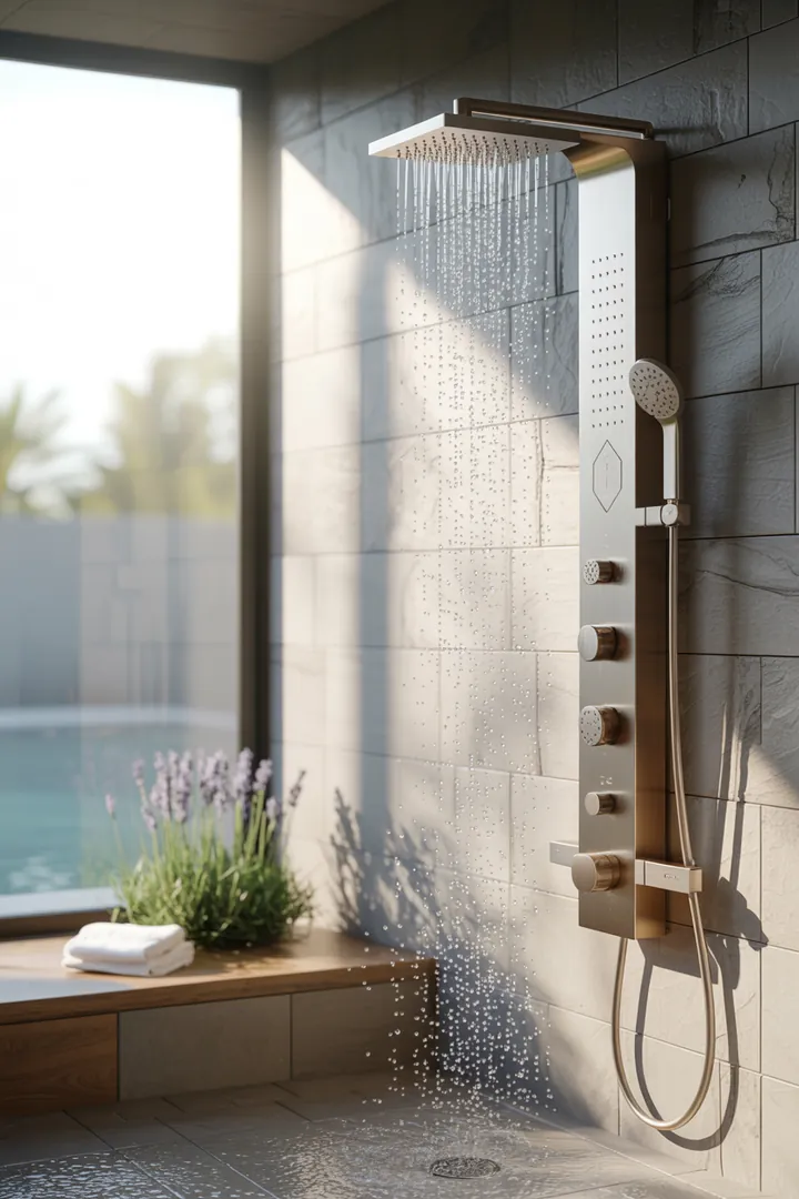 Moderne Paneele bieten Regendusche, Massagedüsen & Handbrause in einem – kompakt montiert und platzsparend.
