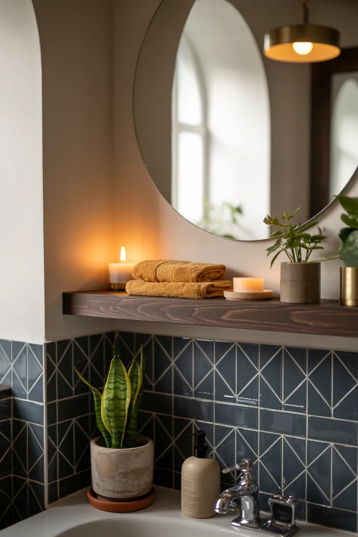 Ein Farbkontrast – z. B. ein dunkles Regal oder eine markante Deko-Fliese – sorgt für Tiefe und Charakter. Wichtig ist: Nie zu viele Farben auf engem Raum – maximal drei harmonierende Töne wirken stilvoll und ruhig.