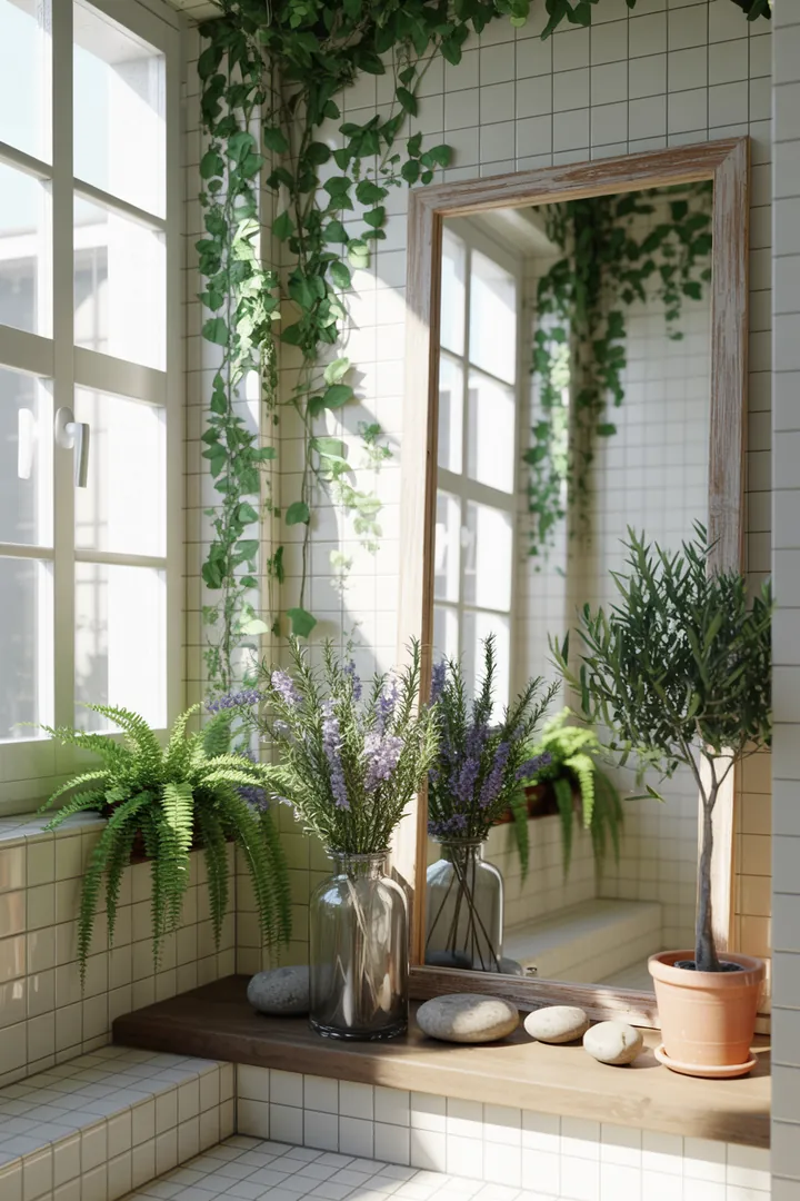 Grüntöne mit hellen Fliesen oder Holzoptik-Boden erzeugen Dschungel-Flair auf kleinem Raum.