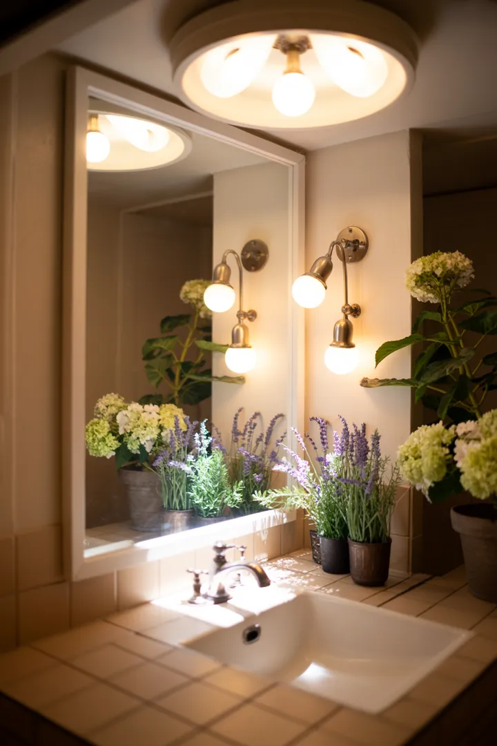 Deckenleuchte plus Spiegelbeleuchtung plus stimmungsvolle Spots – das ist der Dreiklang für Atmosphäre. Warmweißes Licht ist am besten geeignet, da es weich und hautfreundlich wirkt.