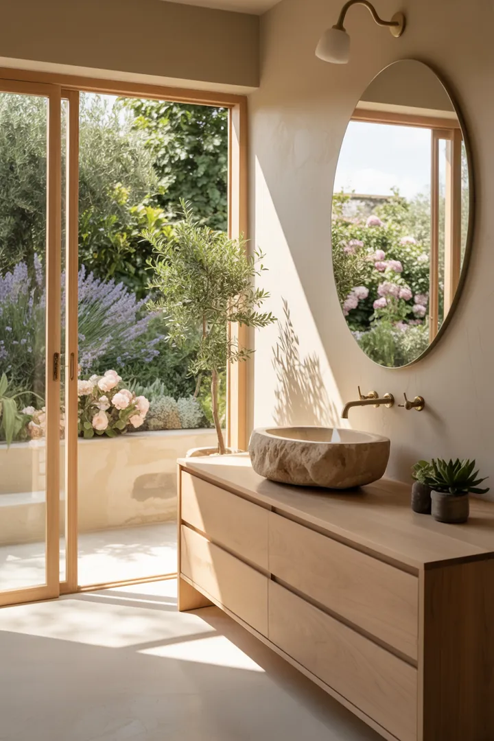 Zum Angebot bei Amazon*Holz, Stein oder Naturputz bringen eine wohnliche Komponente ins Bad. Besonders in kleinen Räumen erzeugen helle Holzarten wie Esche oder Birke eine warme, freundliche Atmosphäre. Kombiniert mit matten Armaturen in Schwarz oder Messing entsteht ein Stil-Mix aus Natürlichkeit und urbanem Chic.