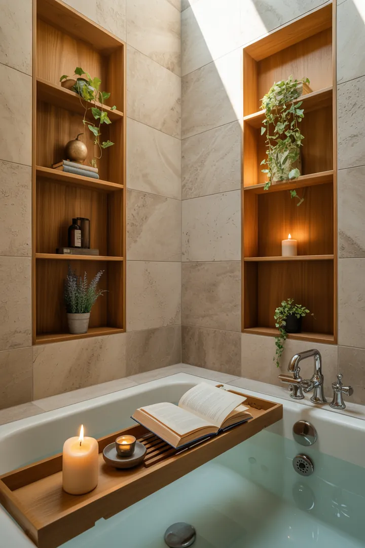 Zum Angebot bei Amazon*Stellen Sie sich eine Sitzwanne vor, umrahmt von Wandnischen mit Eichenholzverkleidung. Ein weiches, indirektes Licht streift über beige Fliesen in Natursteinoptik. Auf dem Rand der Wanne liegt ein Holztablett mit Duftkerze und Buch. Die Atmosphäre: ein Waldspaziergang – inmitten Ihrer Wohnung.
