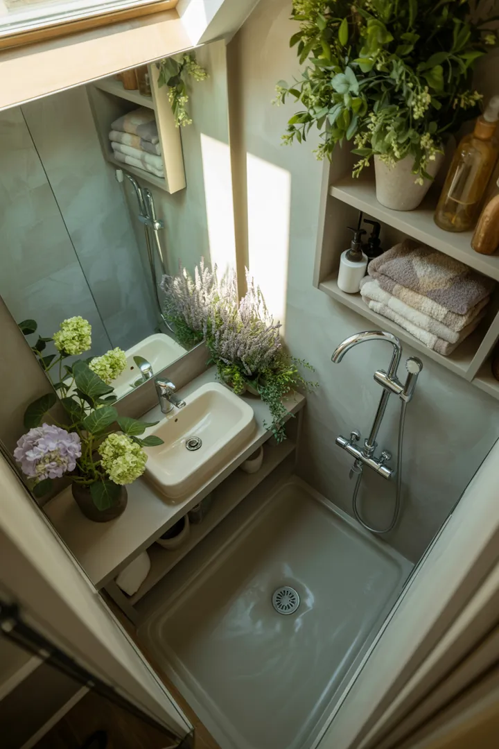- 🪟 Spiegelfliese diagonal in der Ecke → mehr Licht & Raumgefühl
