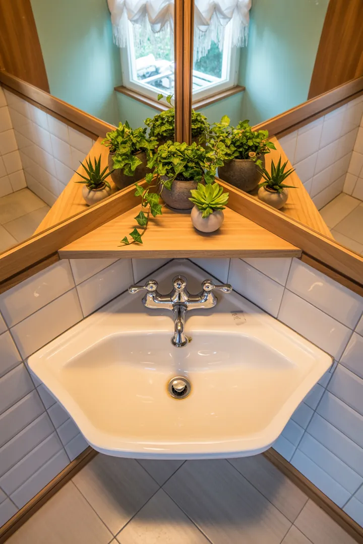 Ein wandmontiertes Eckwaschbecken spart nicht nur Platz – es schafft auch Bewegungsfreiheit im Raum. Kombiniert mit einer kleinen Ablagefläche (z. B. in Dreiecksform darüber oder daneben) entsteht ein funktionales Mini-Zentrum im Bad.
