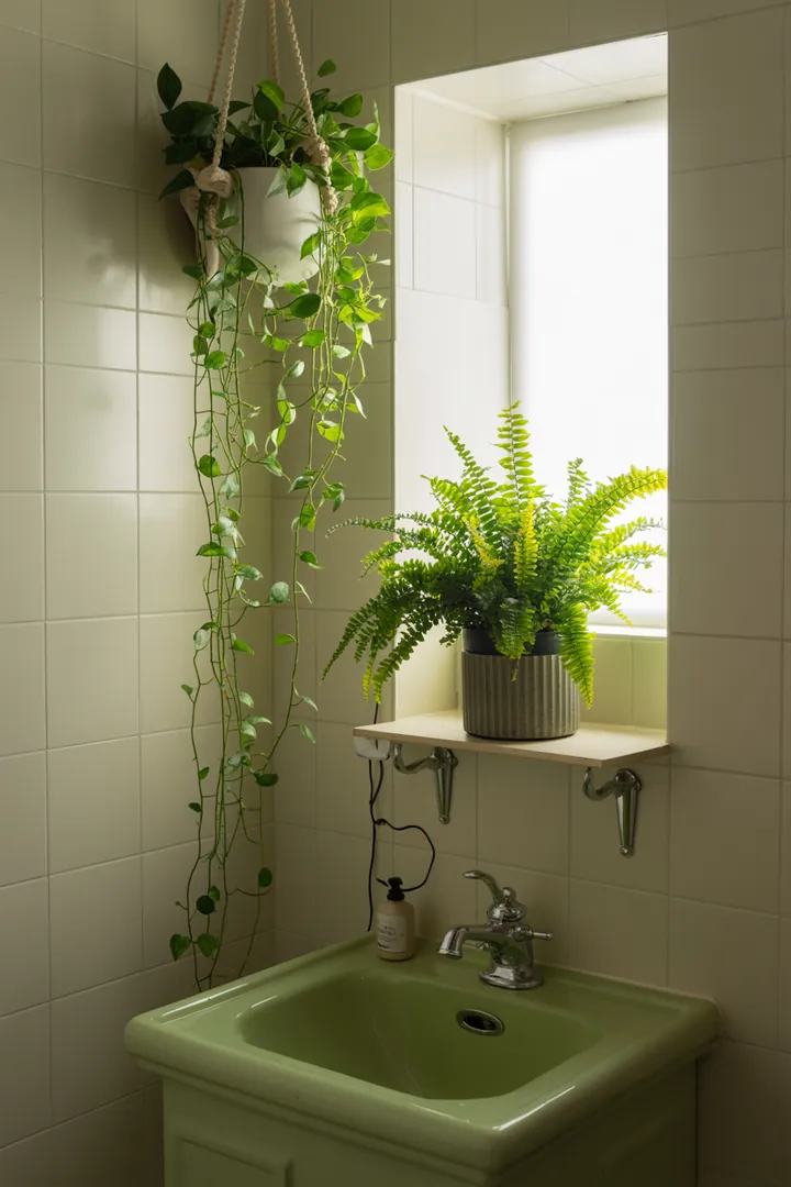 Stellen Sie sich eine helle Fliesecke vor – darüber baumeln Efeutute & Co. von einem Hängeregal, daneben ein kleines Wandregal mit Naturseife, Holzaccessoires und einer Kerze. Diese Bildidee schafft sofort ein Gefühl von Wellness & Frische – ideal für ruhige, grüne Bäder.