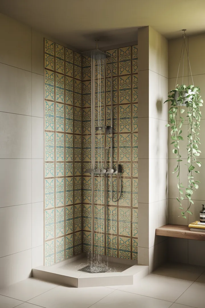 Eine bodengleiche Eckdusche mit einer auffällig gemusterten Fliesenwand in der Ecke – z. B. mit marokkanischem Zementdesign oder Metrofliesen in Fischgrätoptik. Dieses Bild bringt Farbe und Design in einen oft vernachlässigten Bereich.