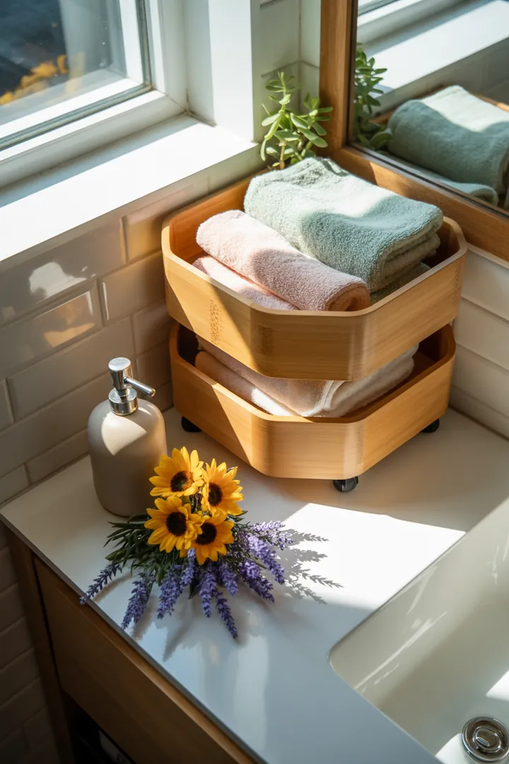 Diese Lösung ist ideal für Mieter:innen: Leichte Eck-Rollcontainer aus Bambus oder beschichtetem Holz lassen sich flexibel verschieben und je nach Tagesbedarf neu positionieren. Sie eignen sich besonders für temporäre Aufbewahrung – etwa für Gästehandtücher oder Babypflege.